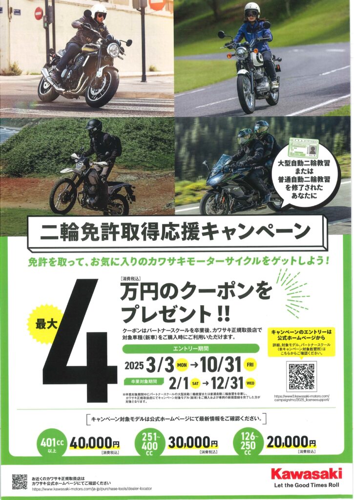 本キャンペーンにエントリーの上、トーア自動車学校にて卒業対象期間中に普通自動二輪または大型自動二輪免許教習を卒業された方は、カワサキ正規取扱店で対象モデルご購入時にご利用いただける最大4万円分の新車購入サポートクーポンがもらえます。